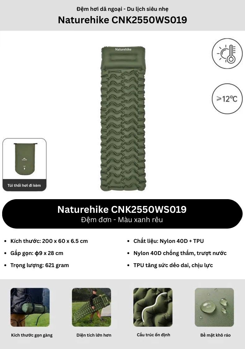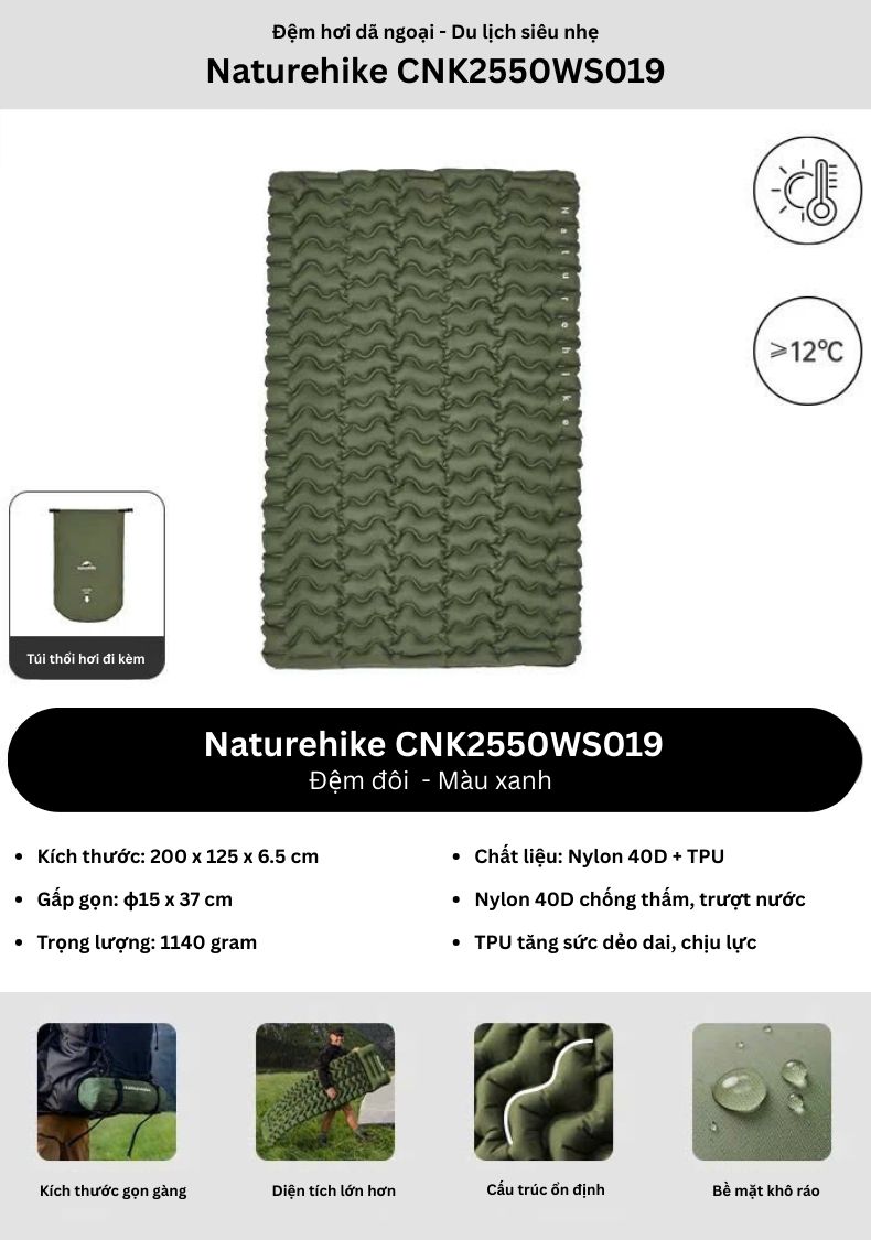 Tạo 01 không gian phát triển riêng, nhiều cơ hội. Và những trải nghiệm tốt hơn, ưu việt hơn với một sản phẩm truyền thống như. Đệm hơi Naturehike CNK2550WS019 siêu nhẹ này thích nghi tốt hơn với những môi trường sinh tồn trong tự nhiên.