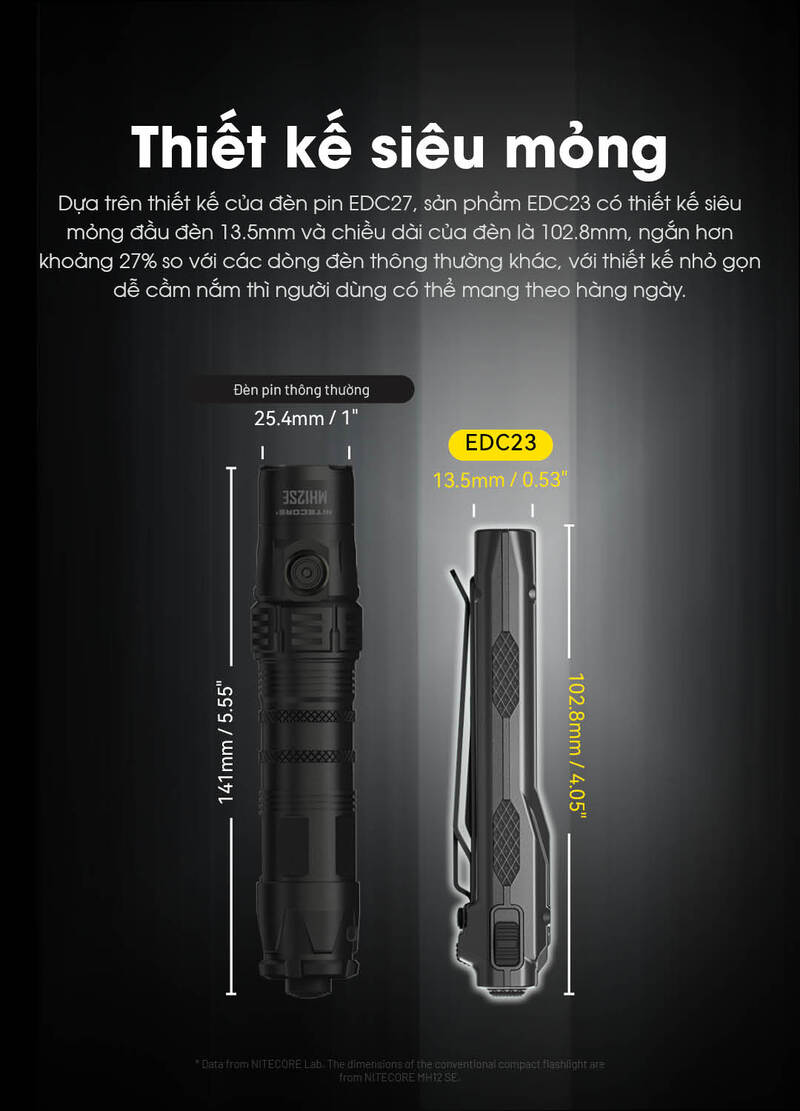 Đèn pin cầm tay siêu gọn Nitecore EDC23. Tiên phong mang tới một thiết kế nhỏ gọn, linh hoạt mang theo bên mình hàng ngày. Công cụ tự vệ, xử trí linh hoạt trong nhiều tình huống, hoàn cảnh. Trước khi, lựa chọn cho khách hàng của Armyhaus: