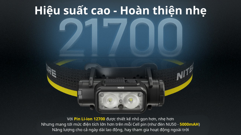 Trước hết, Đèn pin đội đầu siêu nhẹ Nitecore NU50 – Pin 21700 với 5000mAh nâng cấp quan trọng của sản phẩm. Trong đó, khả năng tích điện trên cùng một kích thước Cell Pin. Giúp cho trọng lượng thân đèn khi dùng pin 21700 nhẹ hơn so với pin 18650 trước đó. Mang tới NH50 là một sản phẩm siêu nhẹ. Và mang tới một khả năng mang – đeo trong thời gian dài vô cùng thoải mái, dễ chịu.