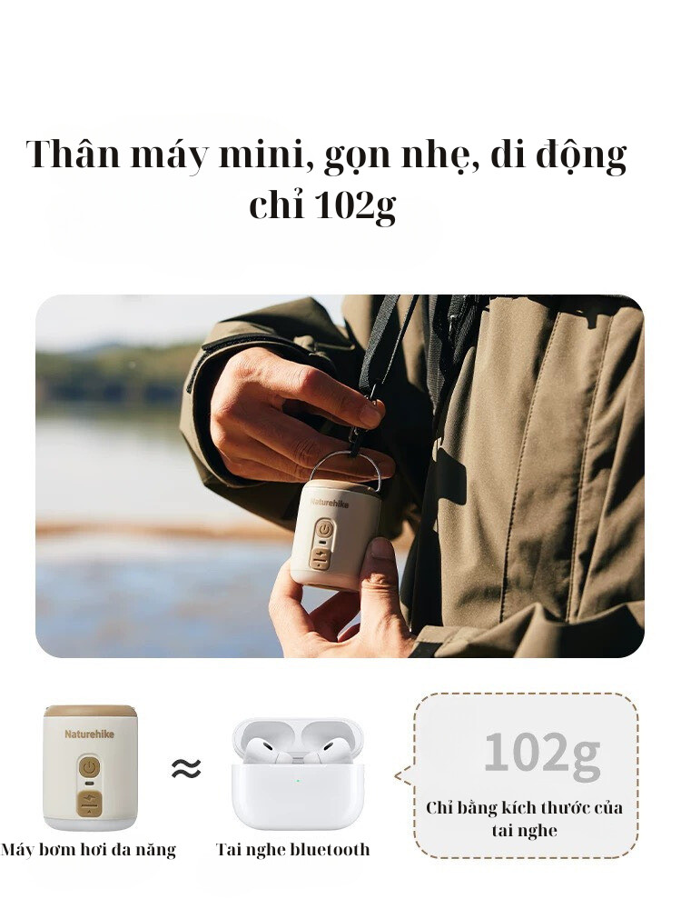 Máy bơm mini đa năng Naturehike CNK2300DQ022. Thiết kế, hoàn thiện với một kích thước thân thiện cho những hành trình Trekking, leo núi. Xử lý nhanh một gối hơi, một phần đệm đơn. Mà không mất hơi thổi, không tốn nhiều thời gian như trước kia.